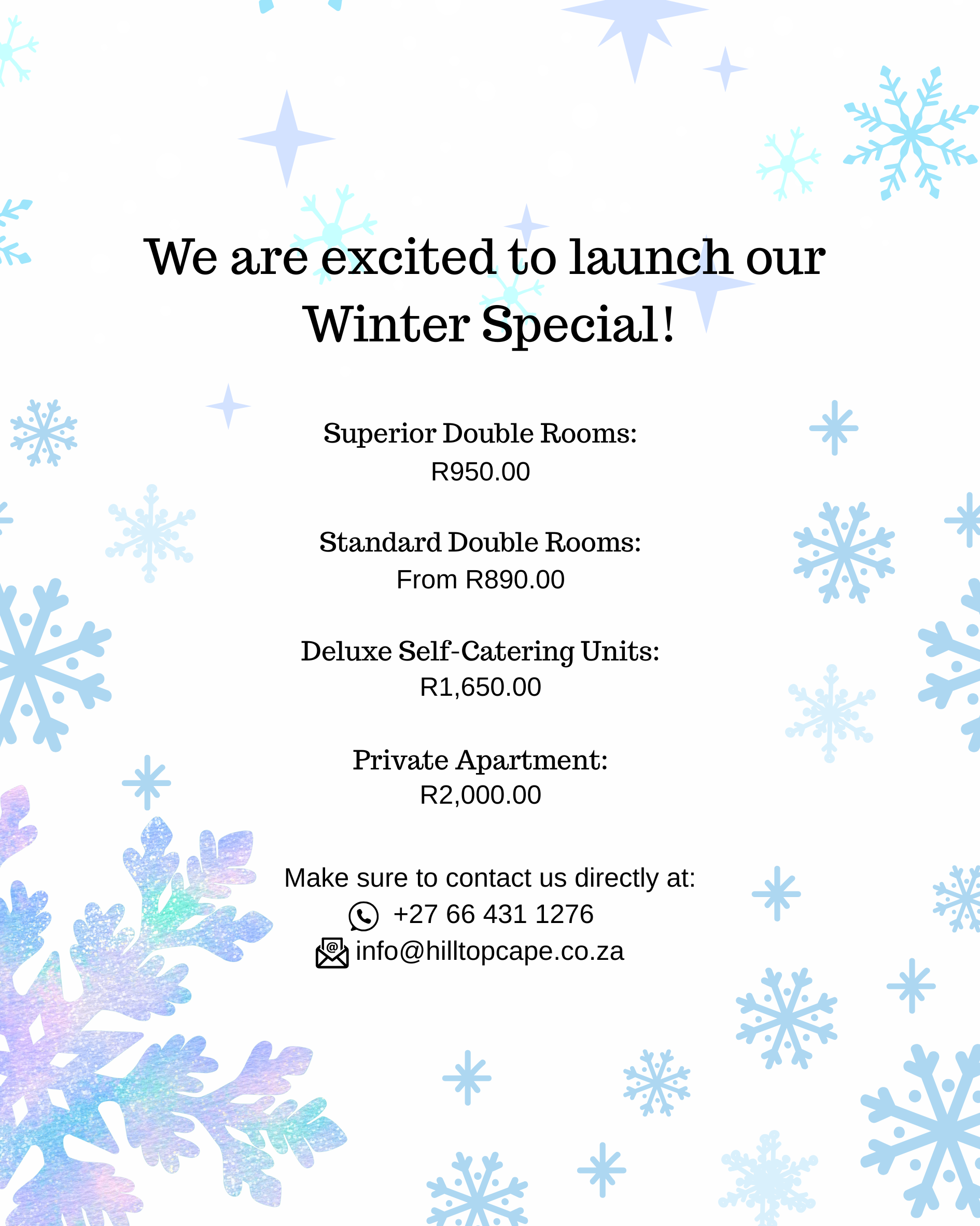 Hilltop Guesthouse in Bellville offers a selection of rooms to suit your needs. Each room type is individually decorated, indulging in each one of your senses and comforts. From here guests can spend balmy summer evenings taking in the breathtaking panoramic views and enjoying the crystal blue pool.
